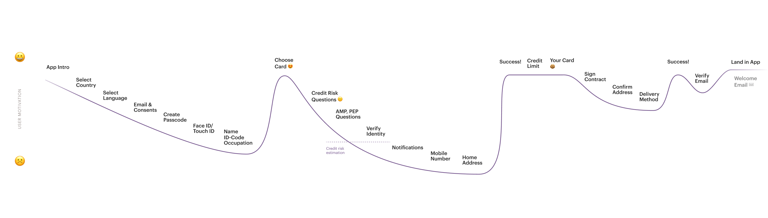 Uued kasutajad peavad läbima standardse KYC protsessi. Selle raames visualiseeris Mobi Labi disainimeeskond empaatiateekonna, et leida kõik kasutaja tipp- ja madalhetked registreerimisprotsessis. Selle abil saime veenduda, et kasutajal on kõrge motivatsioon igal sammul, aga samas ka usaldus ja kergustunne toote vastu.