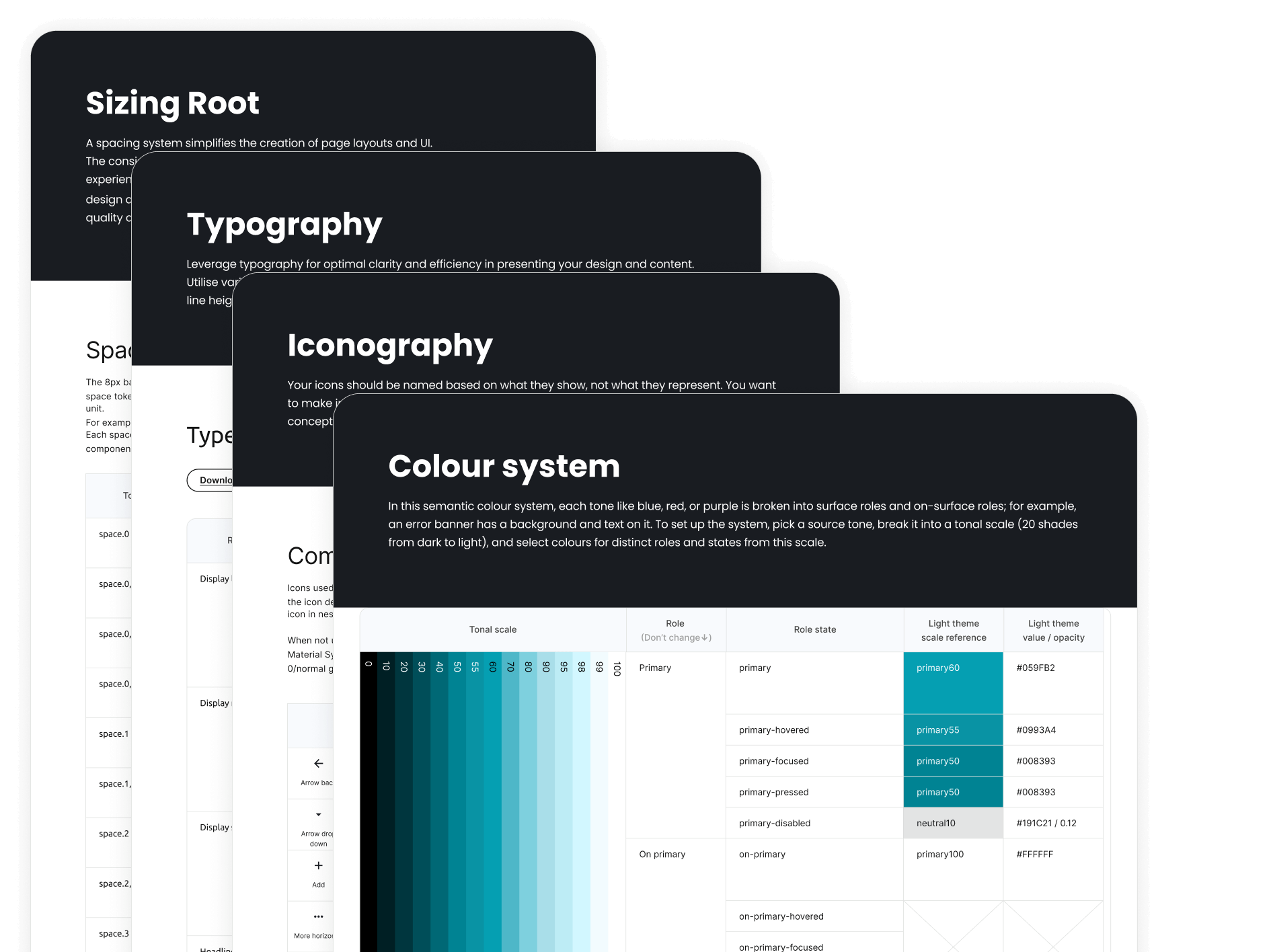 Instead of using a native system, we chose to build a custom design system tailored to their needs—flexible for rapid iteration and consistent across platforms. Darbe uses a web app for job providers to post vacancies and mobile apps (Android and iOS) for job seekers. To ensure a seamless experience across platforms, we based the custom system on Material Design, since Darbe’s existing components already visually resembled Material’s. Before refining components with full functionality and states, we first established the style system foundation, including the colour system, custom iconography, and type and sizing scales. With this in place, we were ready to build the design components and their code equivalents.